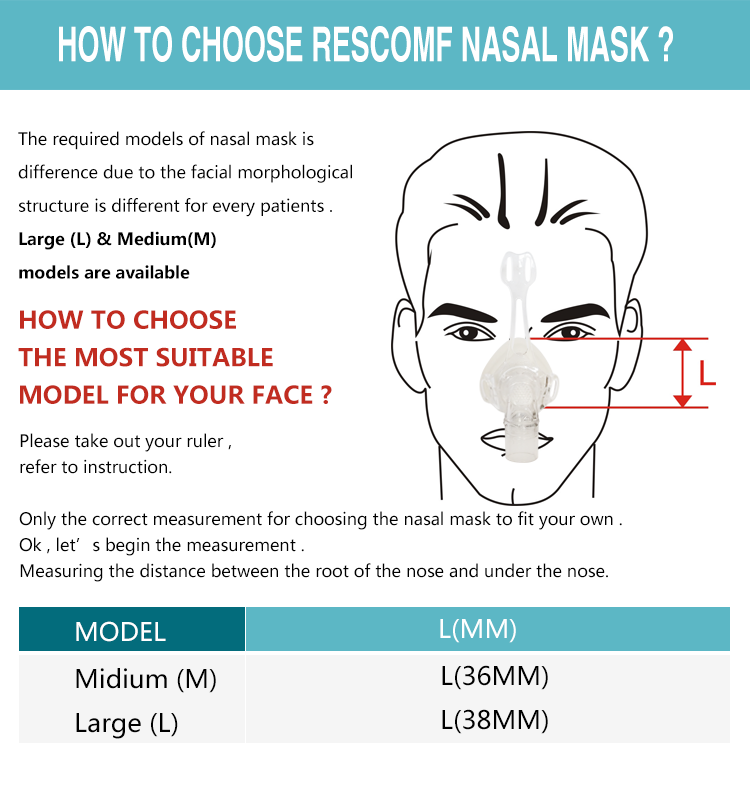 Introducing the RESCOMF Nasal Mask – Your Gateway to Restful Sleep! Revolutionize your positive airway pressure therapy with the Lightly Nasal Mask, meticulously crafted for seamless integration with CPAP and BiPAP devices. This mask is not just a solution; it’s a commitment to comfort and reliability. Sizing Guide: Finding the perfect fit is crucial for optimal therapy. Refer to our comprehensive sizing guide in the image gallery to select the correct mask fit tailored to your unique needs. Key Features: Frame: Experience freedom like never before with our streamlined design that eliminates the need for forehead support. The Lightly Nasal Mask is remarkably light and exceptionally comfortable, ensuring a soothing therapy experience. Cushion: Say goodbye to air leakage concerns with our patented dynamic matching technology. The cushion is not just soft; it’s a haven of comfort, providing a snug fit that enhances the effectiveness of your therapy. Rotating Elbow: Enjoy the freedom to move during the night with a 360° + 45° rotating elbow. No more worries about the mask pulling or tugging – our design adapts to your movements, ensuring uninterrupted sleep. Exhalation Port: Experience tranquility with our intelligently designed exhalation port. Not only does it mute noise for a peaceful atmosphere, but it also diffuses air flow for a gentle and natural breathing sensation. Clip: Simplicity meets functionality with our easy-to-use clip. Attaching and detaching the Lightly Nasal Mask is a breeze, allowing you to focus on what truly matters – a restful night’s sleep. Invest in your well-being with the Lightly Nasal Mask – where innovation meets comfort, and sleep is redefined. Experience the difference today. Nasal Mask Specifications Documentation